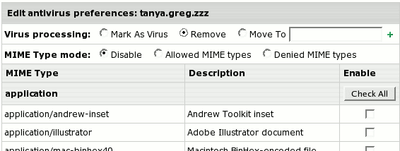 - Denied MIME Types: this lets you mark the MIME Types to be denied,