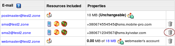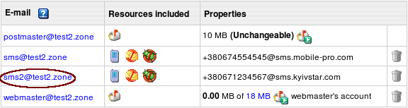 - Click the Mail SMS e-mail address in the E-mail list on the maildomain Controls page: