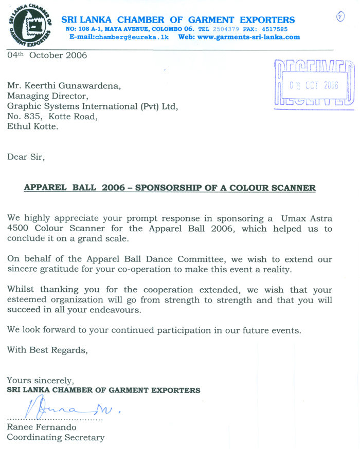 We highly appreciate your prompt response in sponsoring a Umax Astra 4500 Color Scanner for the Apparel Ball 2006, which helped us to conclude it on a grand scale.
