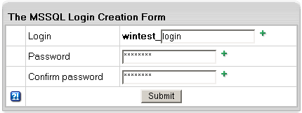- Enter login and password into the MS SQL Login Creation Form that shows: